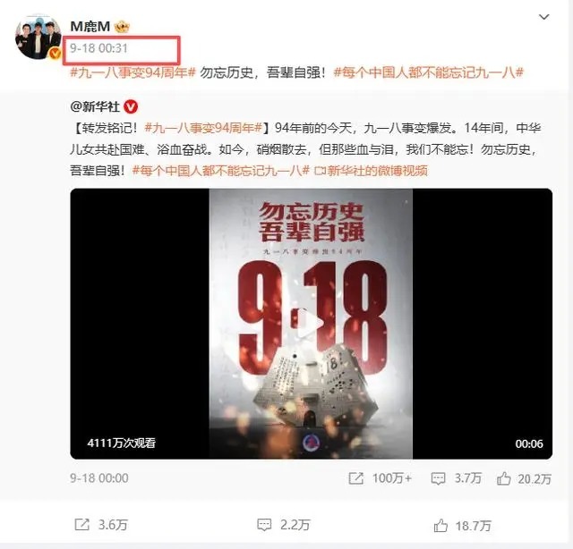 而在关晓彤生日的第二天,鹿晗就在个人社交平台转发了新华社的文章,并配文“勿忘历史,吾辈自强”。