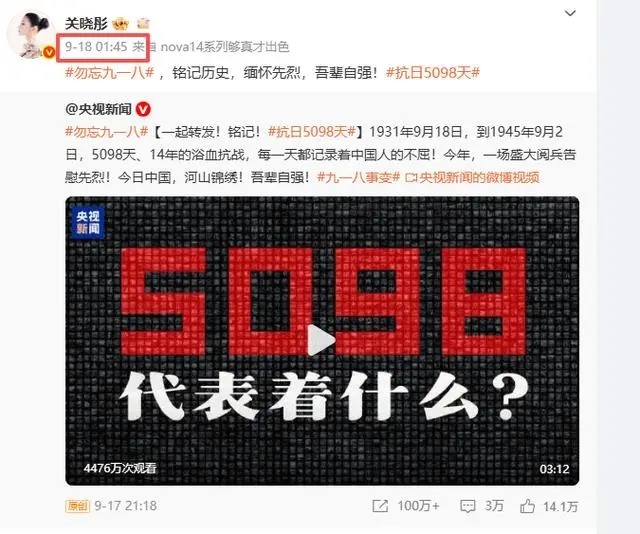 而关晓彤在9月18号同样也转发了一条央视新闻918的文章。